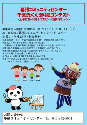 千葉氏くん(*1)のぬり絵コンテストを3/7~5/31の期間、開催します。ぬり絵の台紙は幕張コミュニティセンター1階で配布しています。自由にぬり絵をして、幕張コミュニティセンターの受付までお持ちください。ご提出いただいた […]