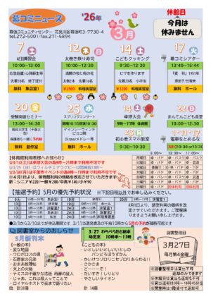 幕張コミュニティセンターでは、月に1回、「幕コミニュース」を作成しております。各種イベント案内、図書室での3月新刊、諸室の優先予約状況(2か月先)、体育館の使用状況など情報が盛りだくさん。ロビーに掲示、配布しております! […]