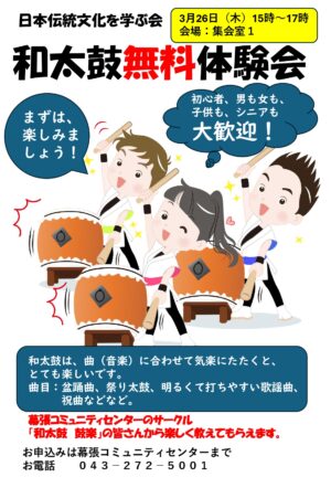 和太鼓は、曲(音楽)に合わせて気楽にたたくと、とても楽しいですいろんな曲で太鼓の達人を目指してみませんか? 大人も子供も、どなたでも楽しめます。指導は、幕張コミュニティセンターのサークル「和太鼓 鼓楽」の皆さんが楽しく教 […]