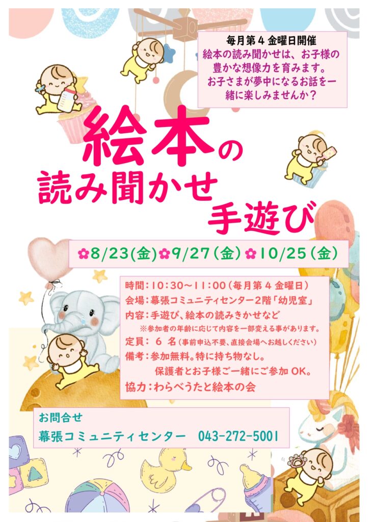 わらべ歌と絵本会~絵本読み聞かせ~8/23(金)・9/27・10/25第4金曜日♪ 2024年8月9日 最終更新日時 : 2024年10月25日 takasu-2005 開催済 お申込不要。直接、幕張コミュニティセンター2F「幼児室」にお越しください♪