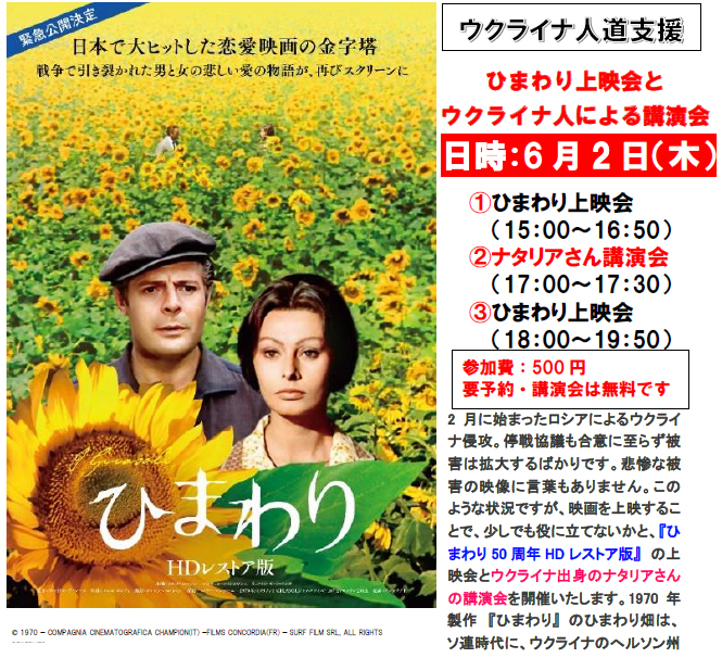 2月に始まったロシアによるウクライナ侵攻。停戦協議も合意に至らず被害は拡大するばかりです。 悲惨な被害の映像に言葉もありません。このような状況ですが、映画を上映することで、少しでも役に立てないかと、『ひまわり50周年HDレストア版』の上映会とウクライナ出身のナタリアさんの講演会を開催いたします。1970年製作『ひまわり』 のひまわり畑は、ソ連時代に、ウクライナのへルソン州で撮影されました。戦争で引き裂かれた悲しい愛の物語です。戦争のもたらすものについて感じ、考えていただく機会になればと思います。会場では、ウクライナ人道支援のための募金箱も設置いたします。寄付先は、日本赤十字社、ユニセフ、国連UNHCR(難民高等弁務官事務所)など、ウクライナの人々の命を守るための活動をする団体のいずれかに、と考えています。