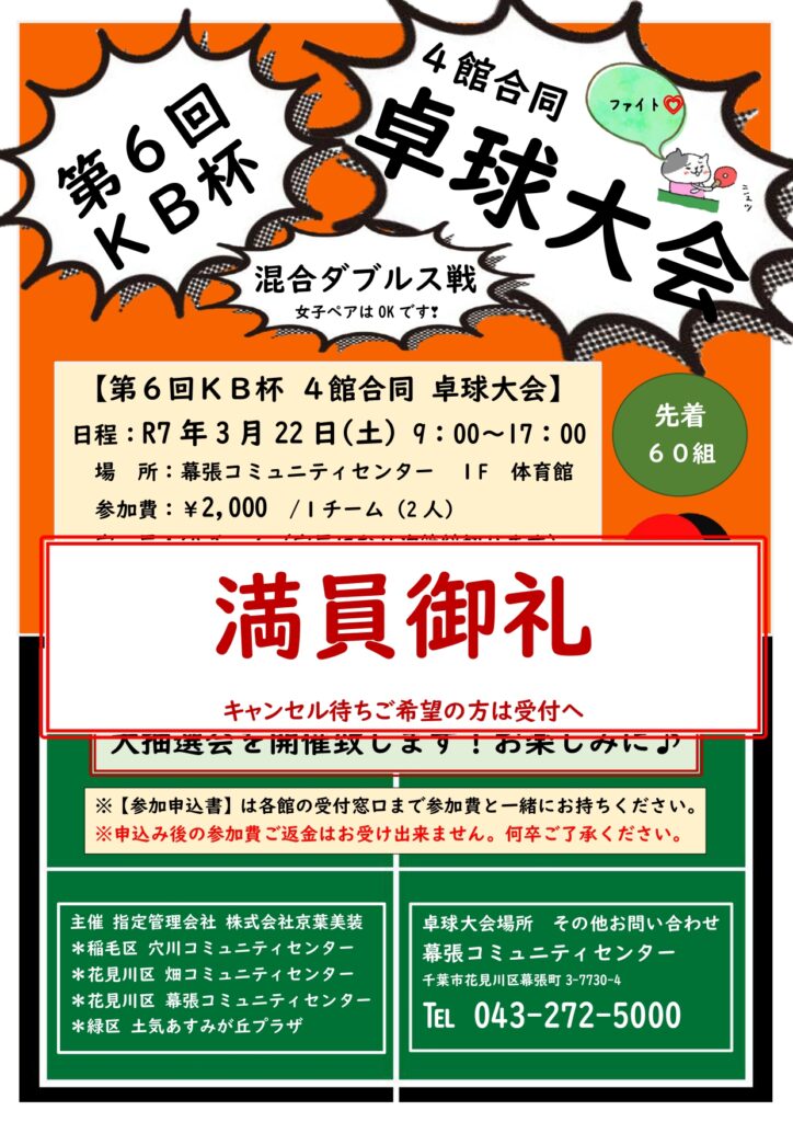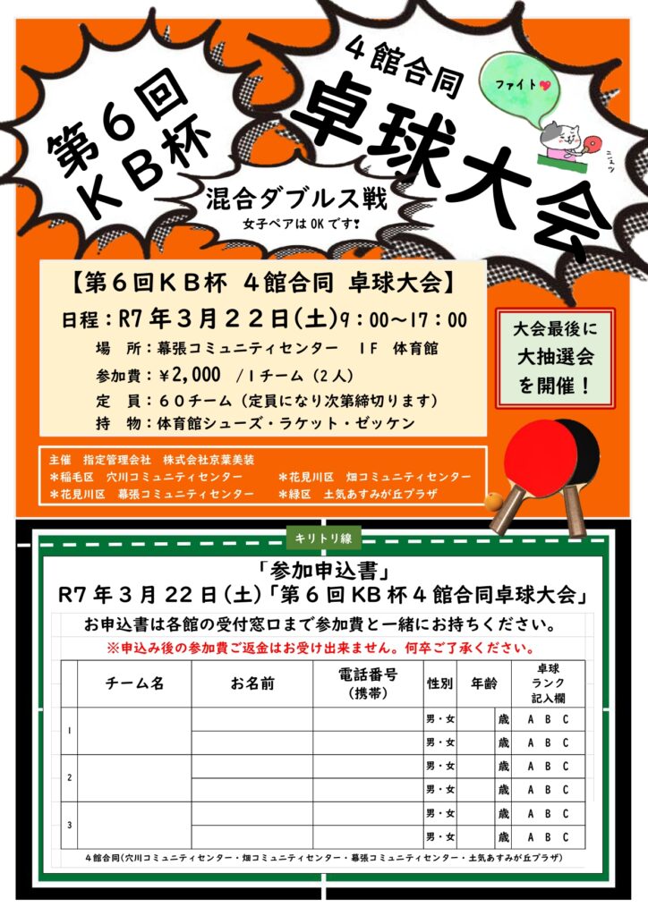 令和7年3月22日(土)「第6回KB杯4館合同卓球大会」開催決定!!満員御礼!