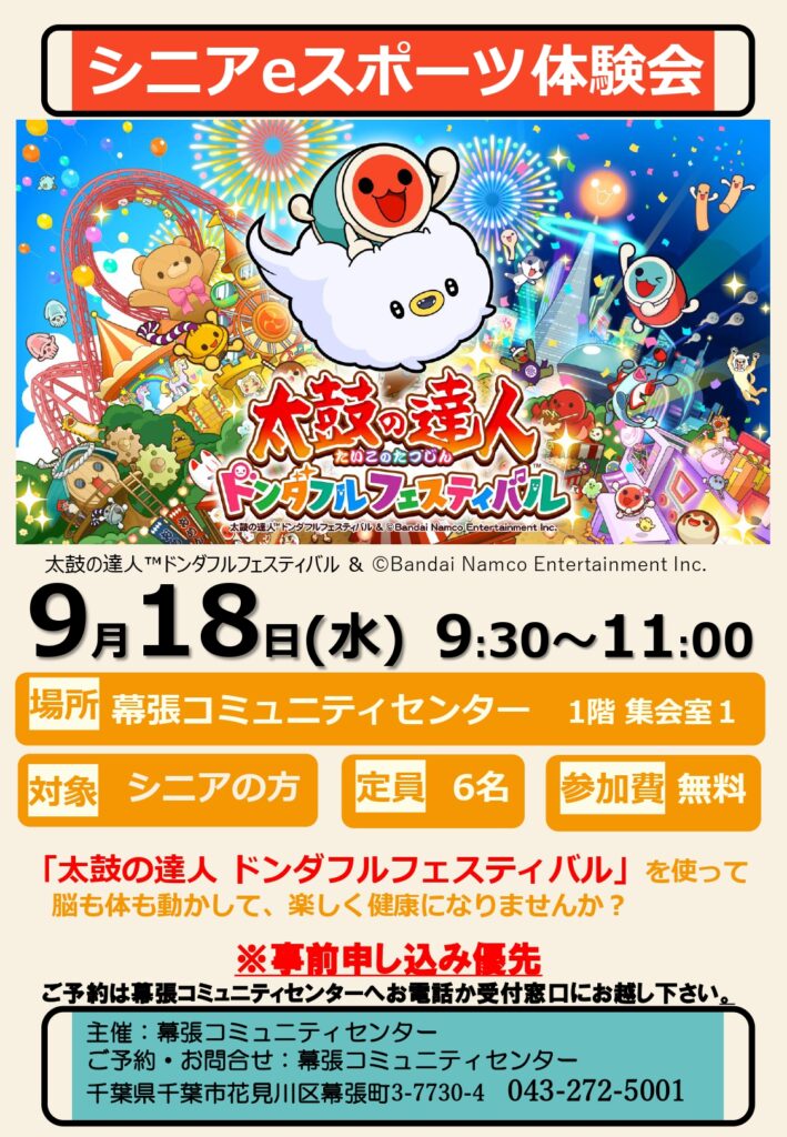 シニアの健康促進のため、eスポーツ体験会(ゲーム「太鼓の達人」)を行います。参加費無料。事前予約必要です。定員6名様。ご予約は幕張コミュニティセンター(℡043-272-5001)へお気軽にご連絡ください。