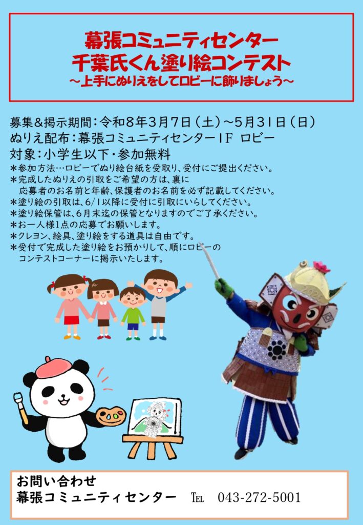 千葉氏くん(*1)のぬり絵コンテストを3/7~5/31の期間、開催します。ぬり絵の台紙は幕張コミュニティセンター1階で配布しています。自由にぬり絵をして、幕張コミュニティセンターの受付までお持ちください。ご提出いただいたぬり絵は、会期中1階ロビーに展示いたします。応募お待ちしています。
