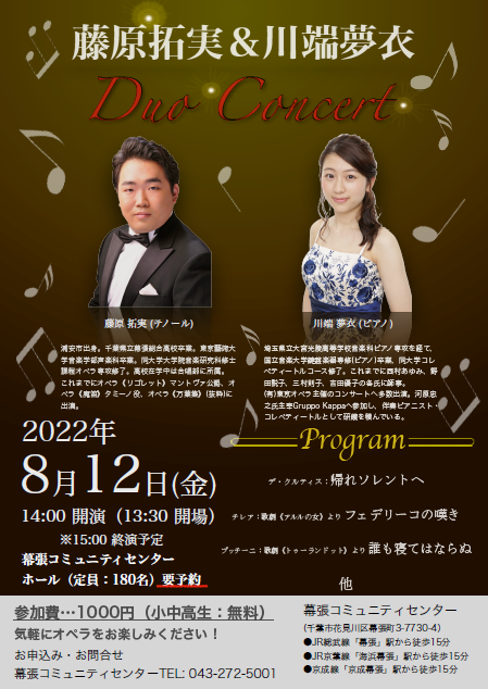 藤原拓実・川端夢衣「デュオコンサート」を開催します