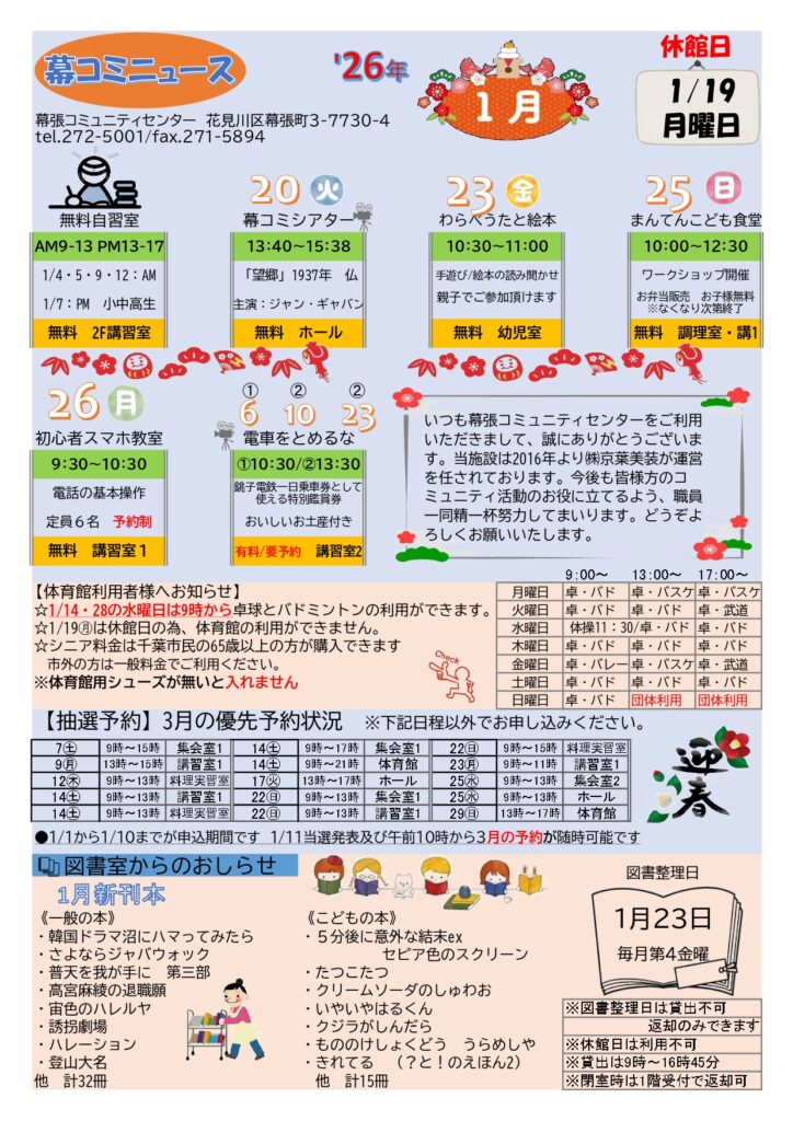 各種イベント案内、図書室での1月新刊、諸室の優先予約状況(2か月先)、体育館の使用状況など情報が盛りだくさん。ロビーに掲示、配布しております!!
