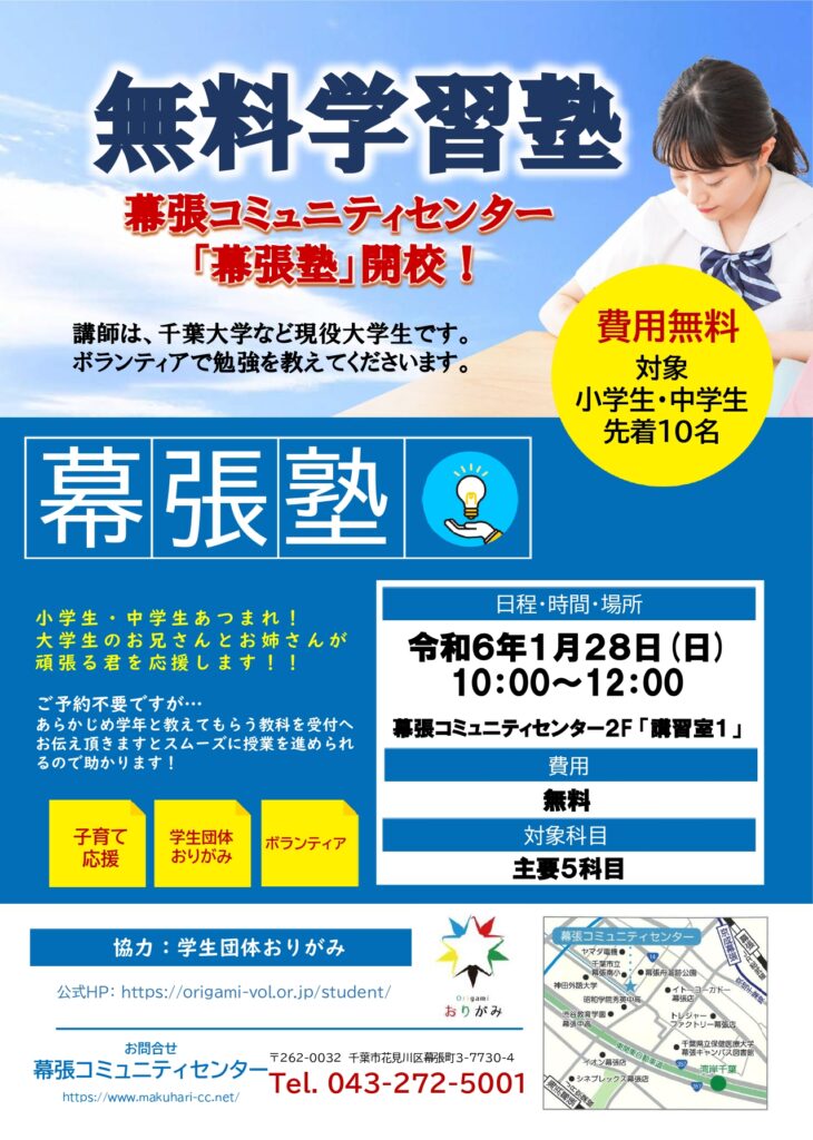 1月28日(日)無料学習塾「幕張塾」開校! 2024年1月4日 最終更新日時 : 2024年2月5日 takasu-2005 開催済 子育て応援事業。費用無料です。ぜひこの機会に、お兄さん、お姉さんに沢山質問してみよう!