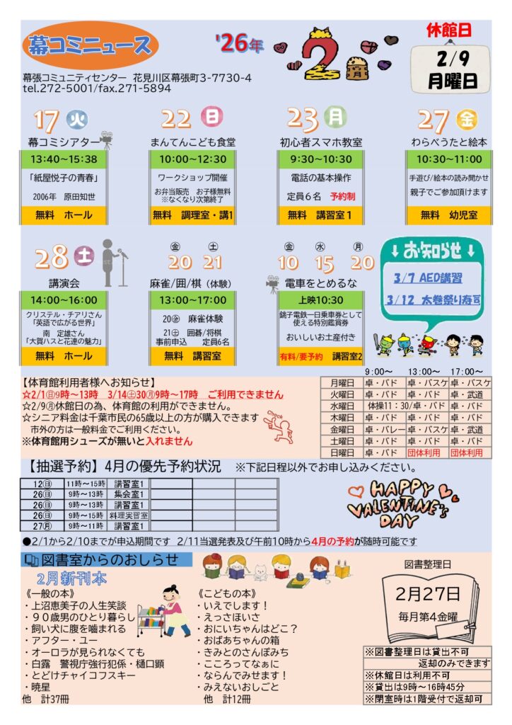 2月の幕コミニュース! 2026年1月27日 最終更新日時 : 2026年3月8日 takasu-2005 開催済 幕張コミュニティセンターでは、月に1回、「幕コミニュース」を作成しております。各種イベント案内、図書室での2月新刊、諸室の優先予約状況(2か月先)、体育館の使用状況など情報が盛りだくさん。ロビーに掲示、配布しております!!