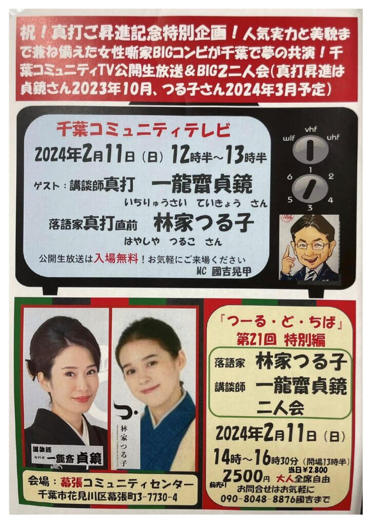 2月11日(日)千葉コミュニティTV「ゲストは林家つるこさん、一龍斎貞鏡さん」ロビーで生放送!
