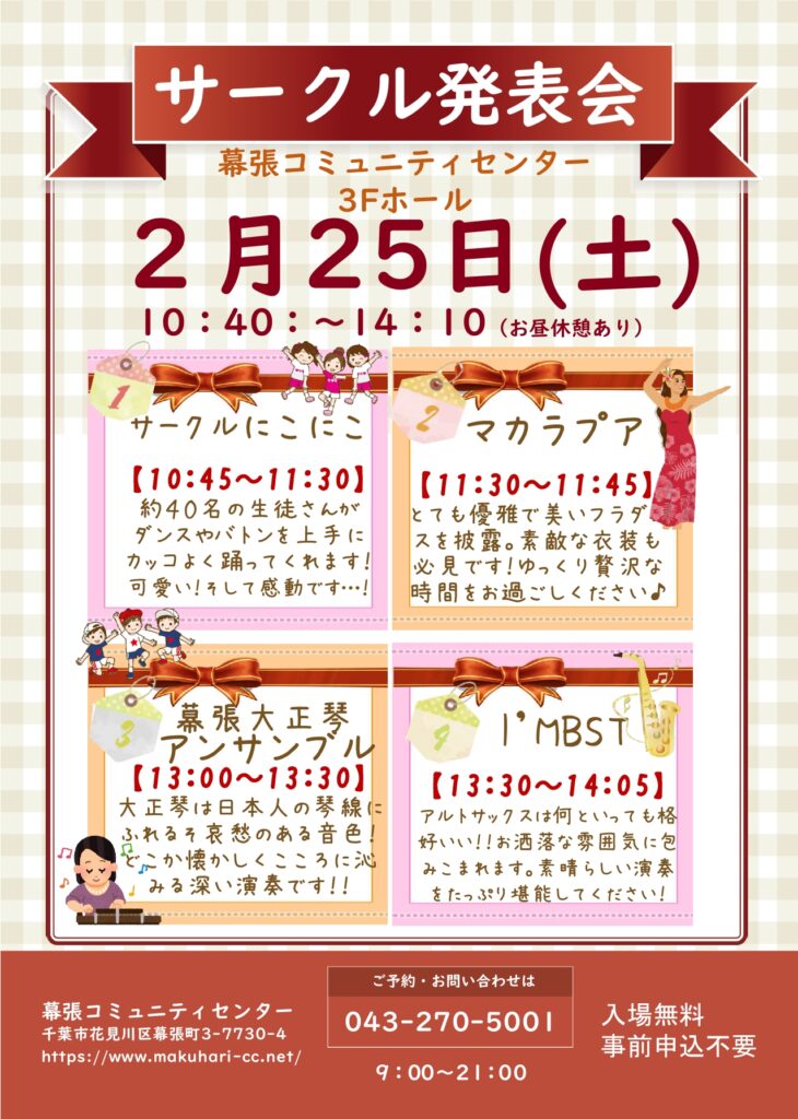 幕張コミュニティセンターのサークルさんの発表の場です。3Fホールにて開催いたします。すばらしい、ダンスや演奏がご覧いただけます。沢山の感動と素敵な時間をお過ごしください♪