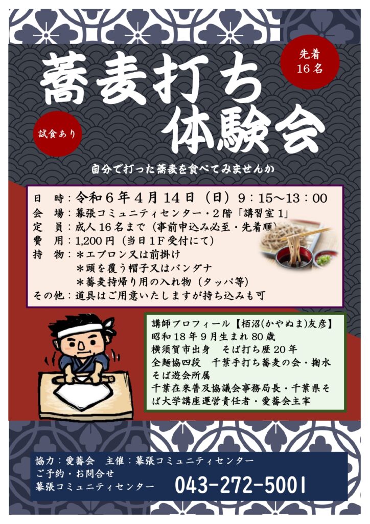 4月14日(火)蕎麦打ち体験会 開催! 2024年2月20日 最終更新日時 : 2024年5月6日 takasu-2005 開催済 人気の蕎麦打ち体験会。先着16名様。ご予約は「幕張コミュニティセンターへ 043-272-5001」