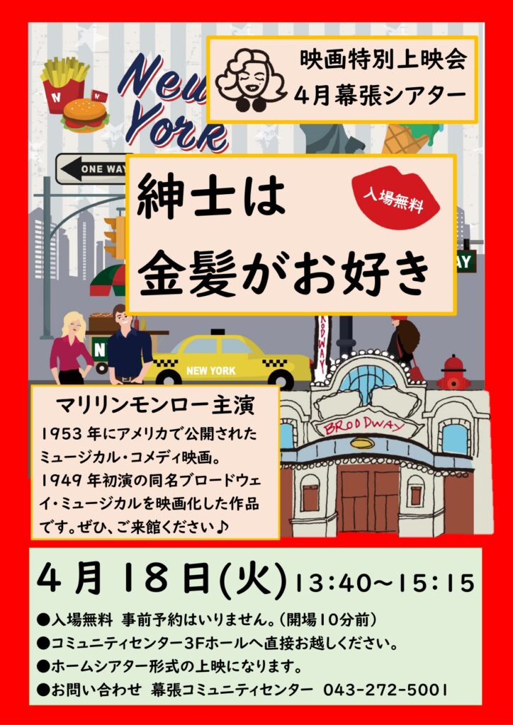 4月18日(火)13:40~映画上映会幕張シアター 2023年4月1日 最終更新日時 : 2023年4月24日 takasu-2005 開催済 毎月第3火曜日は、幕張コミュニティセンターで無料映画上映会を開催しております!お気軽にご参加ください。お待ちしております♪