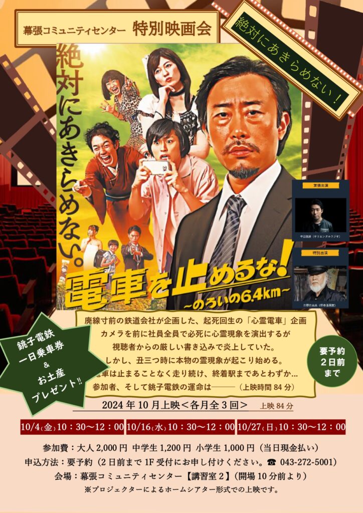 <鑑賞料金>大人2,000円、中学生1,200円、小学生1,000円(当日現金払いとなります)、<特典>「銚子電鉄一日乗車券として使える特別鑑賞券」&「お土産」プレゼント(^-^)、<ご予約方法>2日前までに電話もしくは1階・受付にてご予約ください。幕張コミュニティセンター(代表043-272-5001)