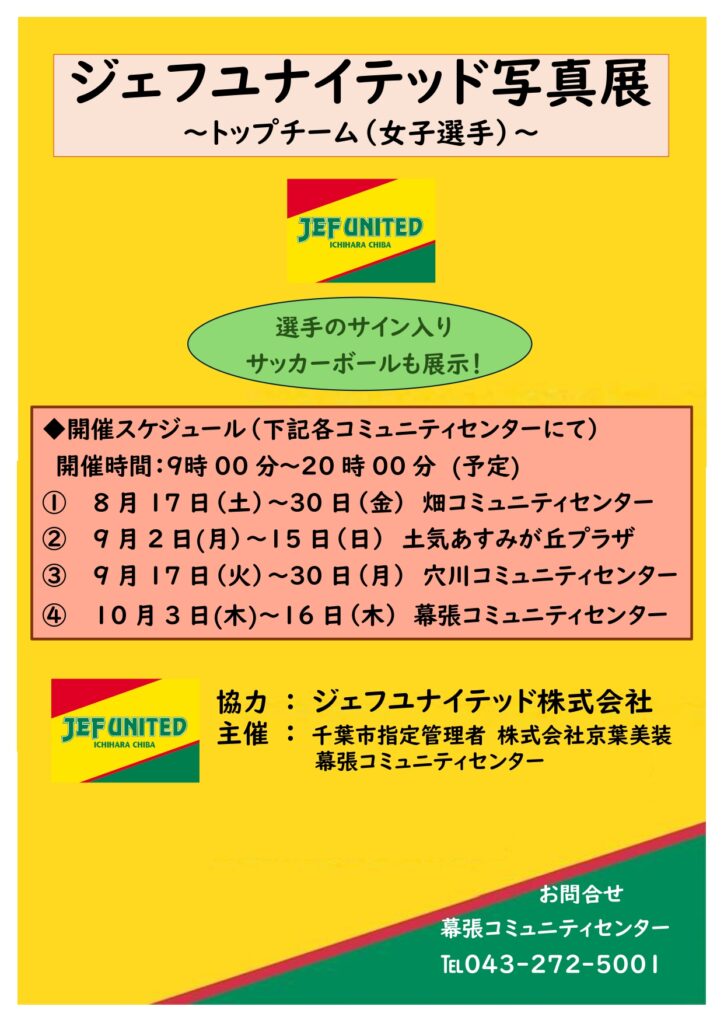 10月3日~10月16日ジェフユナイテッド写真展開催!~トップチーム(女子選手)~ 2024年10月1日 最終更新日時 : 2024年10月18日 takasu-2005 開催済 選手のサイン入りサッカーボール展示コーナーもございます。ぜひご覧ください!素晴らしい写真です!!