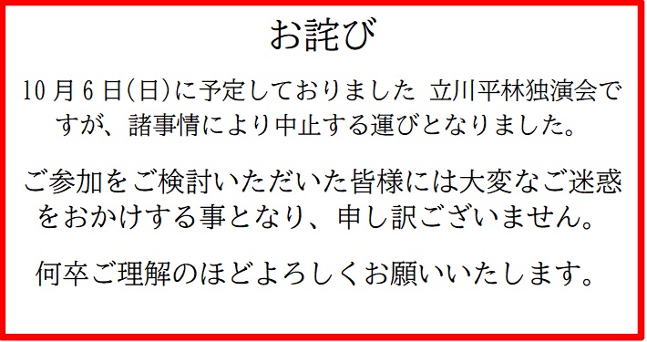 10月6日(日)に予定しておりました 立川平林独演会ですが、諸事情により中止する運びとなりました。