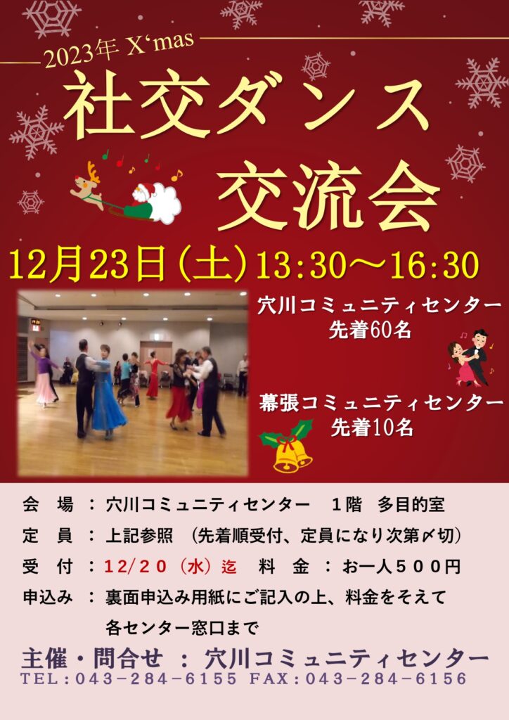 12月23日(土)13:30~16:30 に、穴川コミュニティセンターにて、「社交ダンス交流会」を開催します。クリスマスイブイブに、大人の雰囲気たっぷり、社交ダンス交流会を開催します。皆さんで、素敵な時間をお過ごしください。幕張コミュニティセンターでも、受付開始!参加ご希望の方は、幕張コミュニティセンター 1F 受付にお越しいただくか、お電話でお申し付けください。参加費は¥500で、お電話の方は、12月20日までには、当館の受付にお支払いにいらしてください。