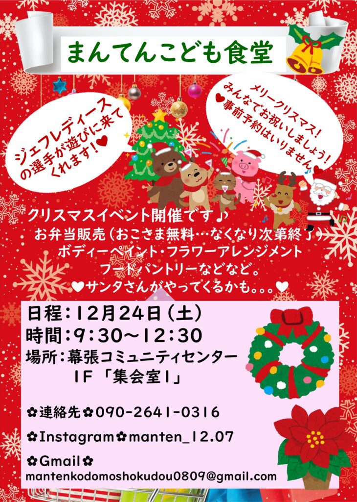 【まんてんこども食堂】クリスマスイベントを開催いたします。お弁当販売(おこさま無料…なくなり次第終了です。)、ボディペイント、フラワーアレンジメント、フードパントリーをご用意。クリスマスイベントのビックサプライズ!!なんどジェフレディースの選手が遊びに来てくれます。サッカーの楽しさを選手に教えてもらいましょう♪たくさんのお友達のご参加をお待ちしております。事前お申し込みはございません。お気軽にお越しください。幕張コミュニティセンター 1Fの「集会室1」のお部屋です。何かご不明な点などございましたら、お気軽にお問い合わせください!