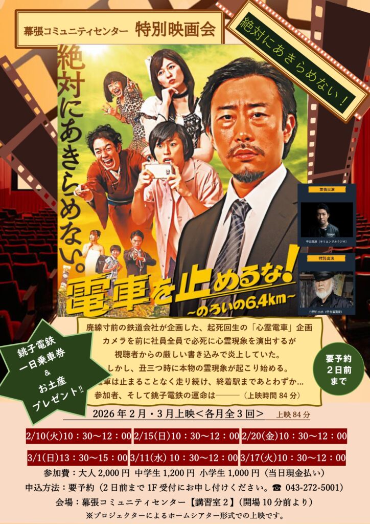 <鑑賞料金>大人2,000円、中学生1,200円、小学生1,000円(当日現金払いとなります)、<特典>「銚子電鉄一日乗車券として使える特別鑑賞券」&「お土産」プレゼントいたします。<ご予約方法>2日前までに電話もしくは1階・受付にてご予約ください。幕張コミュニティセンター(代表043-272-5001)