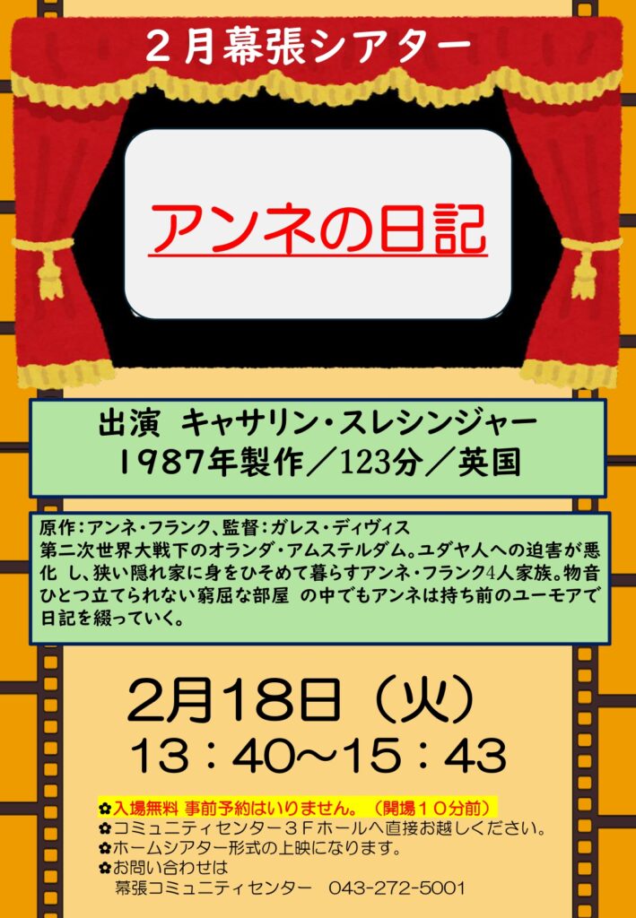 2月18日(火)幕張シアター「アンネの日記」 2025年2月1日 最終更新日時 : 2025年2月23日 takasu-2005 開催済 毎月第3火曜日、幕張コミュニティセンター3F「ホール」にて13:40~放映しております。懐かしい昔の映画が無料で鑑賞いただけます。お申込不要です。ぜひお気軽にお越しください。