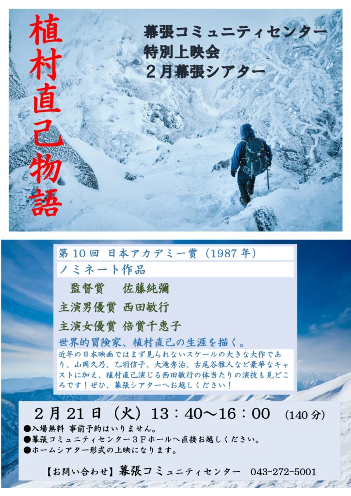 日本アカデミー賞ノミネート作品【植村直己物語】参加無料。 特別上映会開催します!