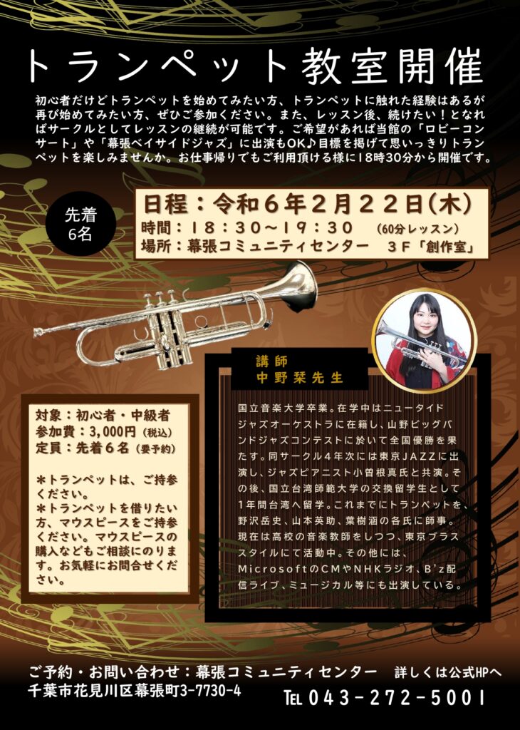 初心者だけどトランペットを始めてみたい方、トランペットに触れた経験はあるが再び始めてみたい方、ぜひご参加ください。また、レッスン後、続けたい!となればサークルとしてレッスンの継続が可能です。ご希望があれば当館の「ロビーコンサート」や「幕張ベイサイドジャズ」に出演もOK♪目標を掲げて思いっきりトランペットを楽しみませんか。お仕事帰りでもご利用頂ける様に18時30分から開催です!