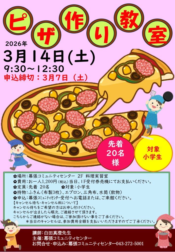 3月14日(土)ピザ作り教室(こどもクッキング教室)開催! 2026年1月30日 最終更新日時 : 2026年1月30日 takasu-2005 未開催 大人気の教室、今回はピザをつくります。どんなピザをつくるかはお楽しみ。対象は小学生です。要予約、参加費1,200円、先着20名、対象は小学生。詳しくはチラシをご覧ください!