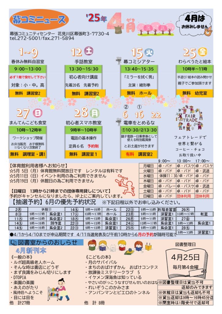 4月の幕コミニュース! 2025年4月1日 最終更新日時 : 2025年5月2日 takasu-2005 開催済 幕張コミュニティセンターでは、月に1回、「幕コミニュース」を作成しております。各種イベント案内、図書室での 4月新刊、諸室の抽選予約状況(2か月先)、体育館の使用状況など情報が盛りだくさん。ロビーに掲示、配布しております!!