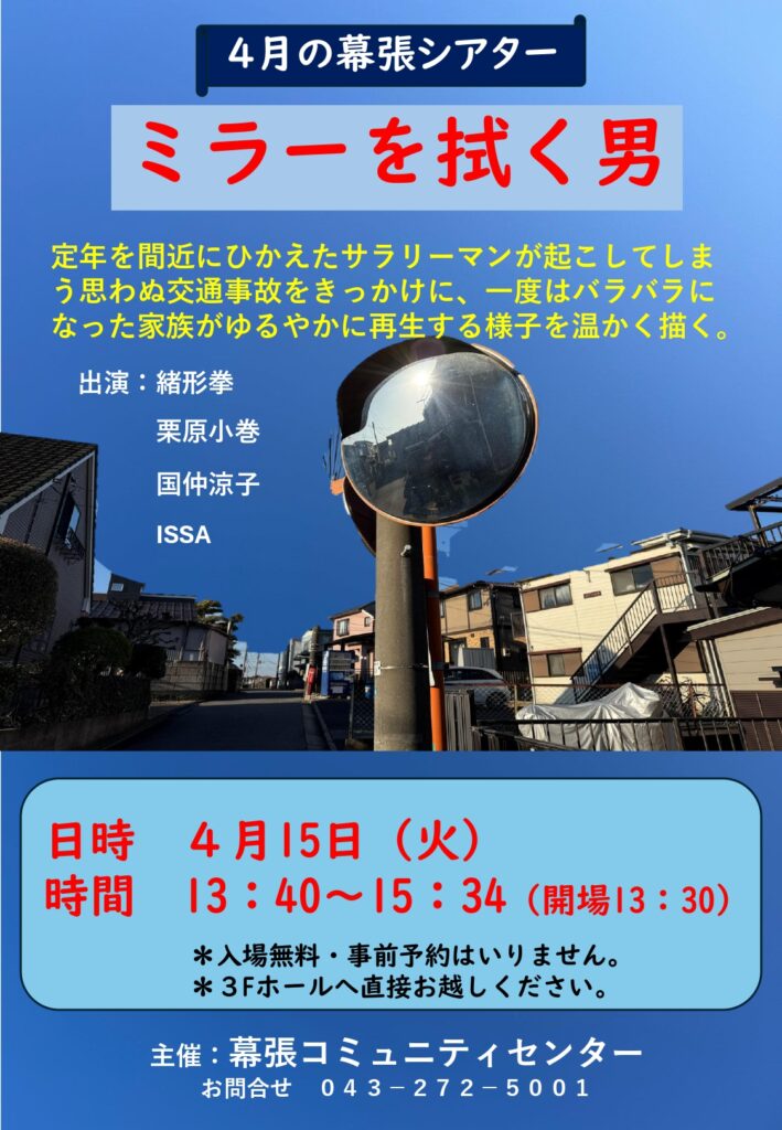 4月15日(火)幕張シアター「ミラーを拭く男」 2025年3月24日 最終更新日時 : 2025年4月18日 takasu-2005 開催済 毎月第3火曜日、幕張コミュニティセンター3F「ホール」にて13:40~放映しております。懐かしい昔の映画が無料で鑑賞いただけます。お申込不要です。ぜひお気軽にお越しください。