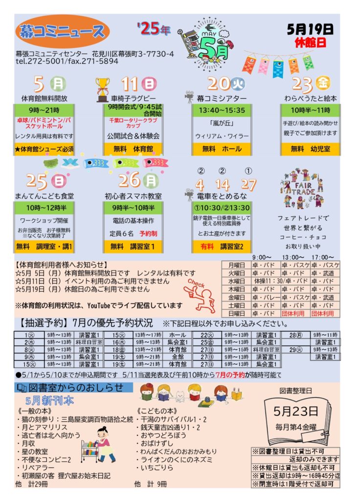 5月の幕コミニュース! 2025年5月2日 最終更新日時 : 2025年6月1日 takasu-2005 開催済 幕張コミュニティセンターでは、月に1回、「幕コミニュース」を作成しております。各種イベント案内、図書室での5月新刊、諸室の抽選予約状況(2か月先)、体育館の使用状況など情報が盛りだくさん。ロビーに掲示、配布しております!!
