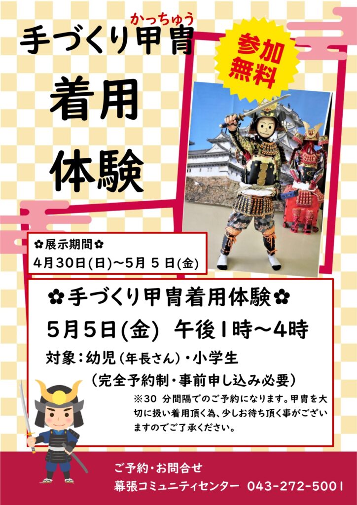 「着用体験」参加無料です。定員5名ですので早めにご予約ください。 5月5日(金)13時~16時の3時間の中でご予約(着用&写真タイムは30分)になります。詳しくは、幕張コミュニティセンター 043-272-5001へ