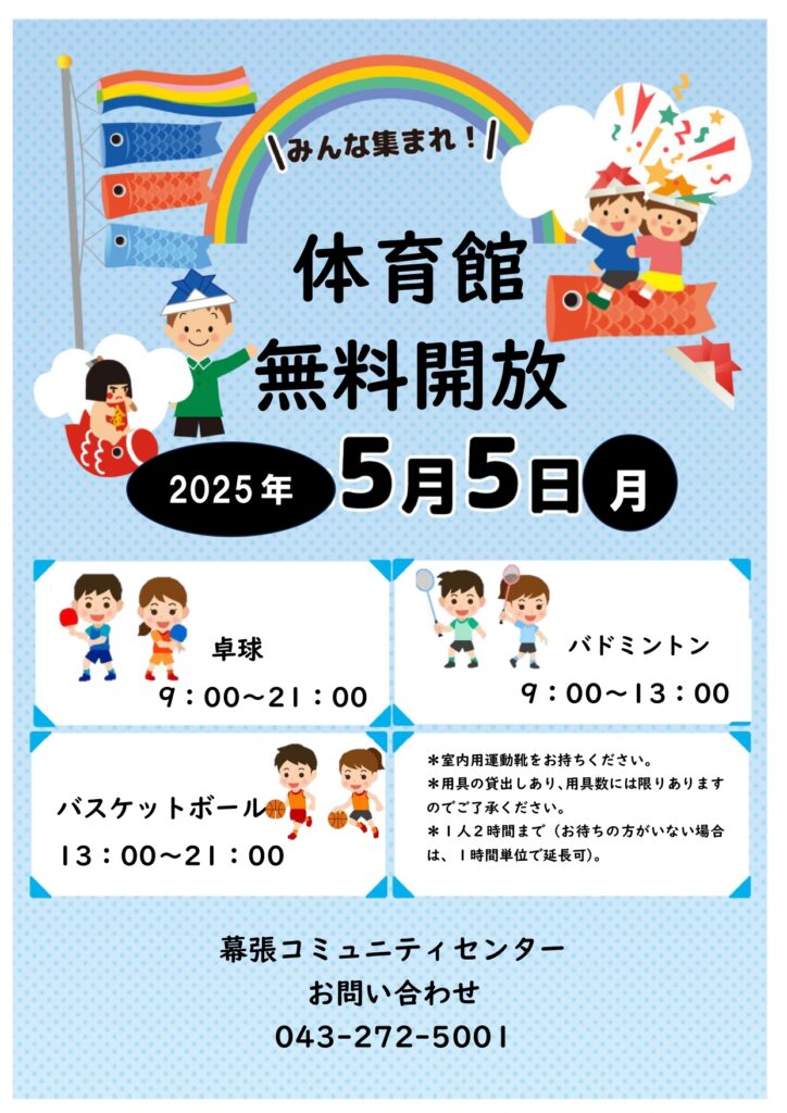 卓球(9時~21時)、バトミントン(9時~13時)、バスケットボール(13時~21時)が無料でご利用いただけます。 お子様だけではなく、大人も無料です。体育館のご利用のご予約は出来ません。当日の朝7:30から、受付表に記入して頂き、9時5分前に順番にお呼びいたします。詳しい内容は、幕張コミュニティセンター043-272-5001へ。ご来館お待ちしております!