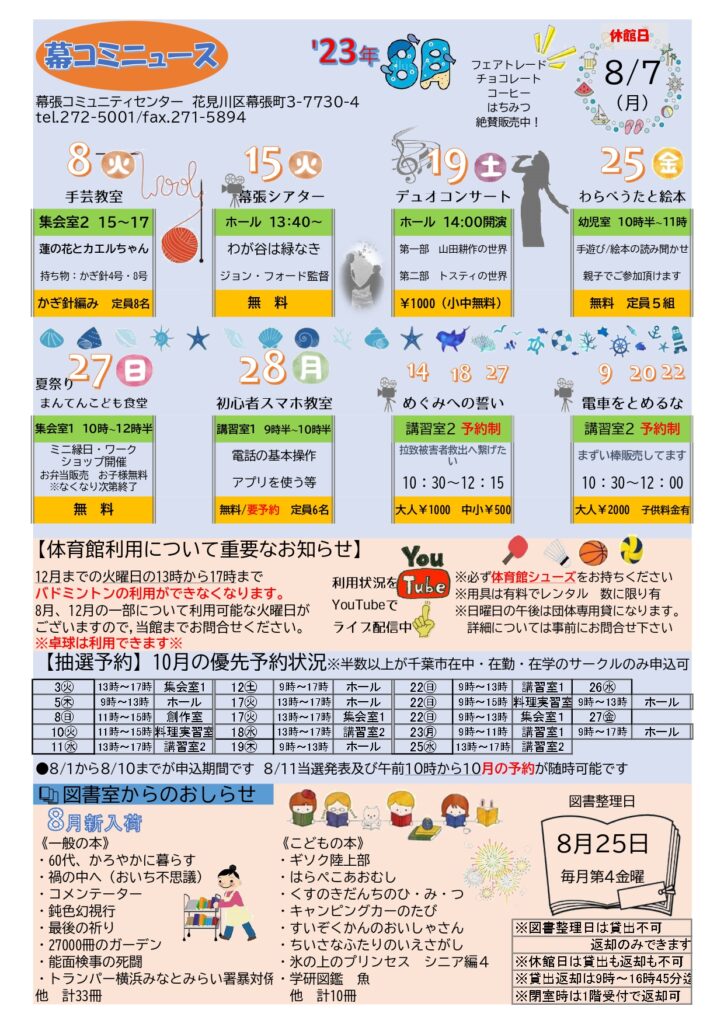 8月幕コミニュース!! 2023年8月1日 最終更新日時 : 2023年10月8日 takasu-2005 開催済 8月もイベントが盛りだくさん。夏休みは、幕張コミュニティセンターへぜひお立ち寄りください。