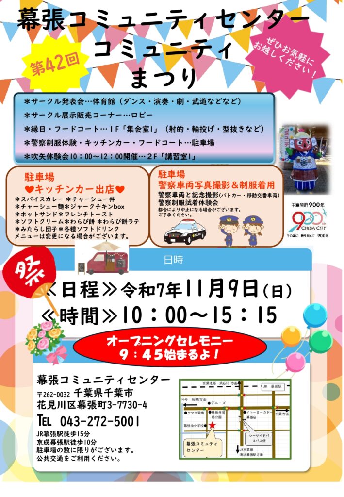 幕張コミュニティセンター コミュニティまつりは、体育館では、ダンス、生演奏、演劇、武道、などなど、ロビーや1階では、作品展示・販売、風船配布、縁日(射的、ヨーヨー釣り、型抜き、輪投げ)、くじ引きなどなど、2階では吹き矢の体験会を催します。駐車場では、警察車両写真撮影や制服着用体験、キッチンカーも出店します!千葉開府900年のマスコットキャラクター千葉氏くんもまつり中、時々出現して、一緒に写真撮影できます!1日楽しめます!お気軽にお越しください、お待ちしています!