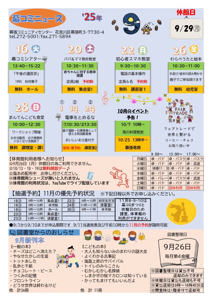 各種イベント案内、図書室での9月新刊、諸室の優先予約状況(2か月先)、体育館の使用状況など情報が盛りだくさん。ロビーに掲示、配布しております!!