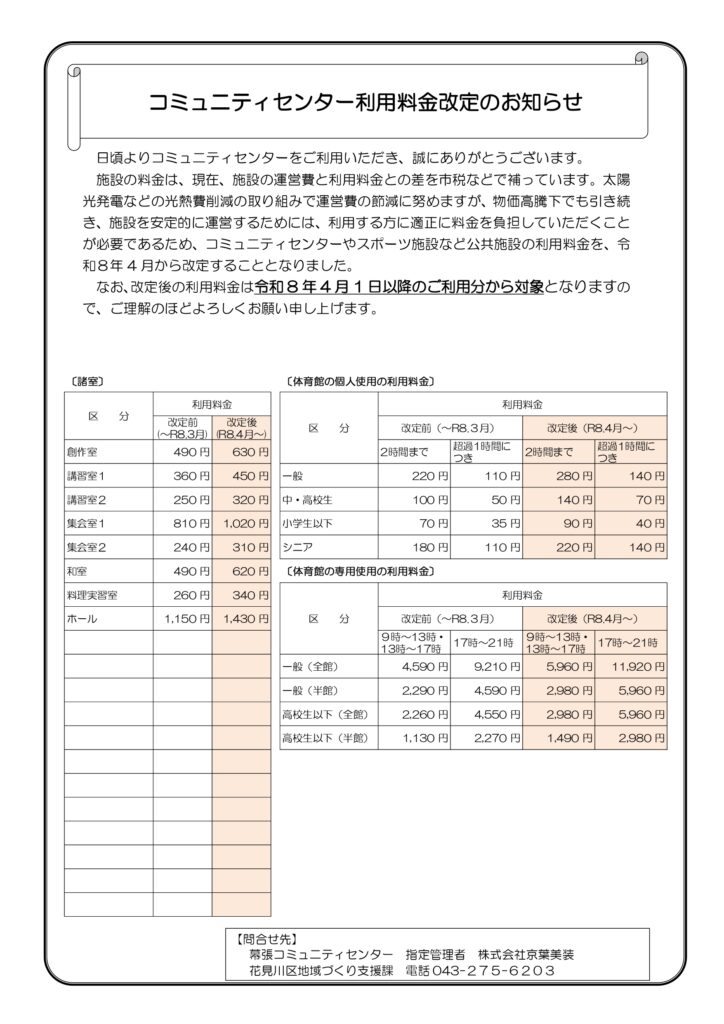 幕張コミュニティセンター利用料金改定のお知らせ